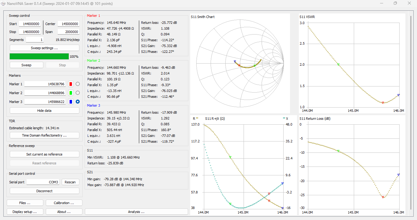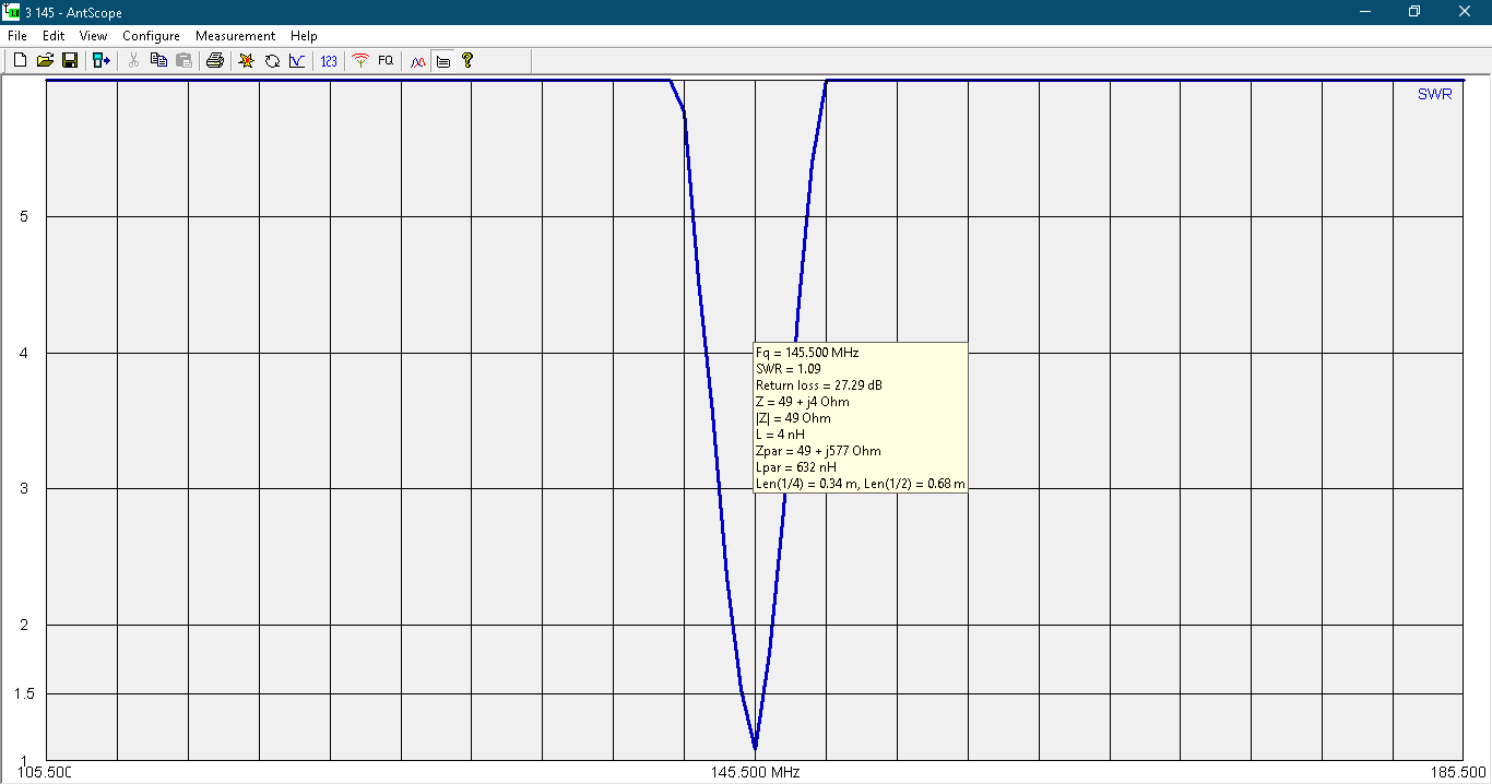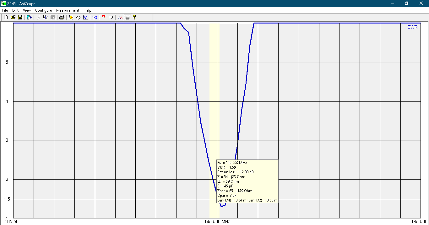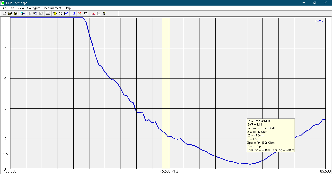 b) na kmitočtu 145.5 MHz mají VSWR horší než 2 (viz obrázek), ale mají