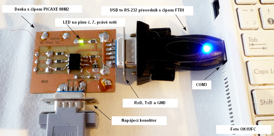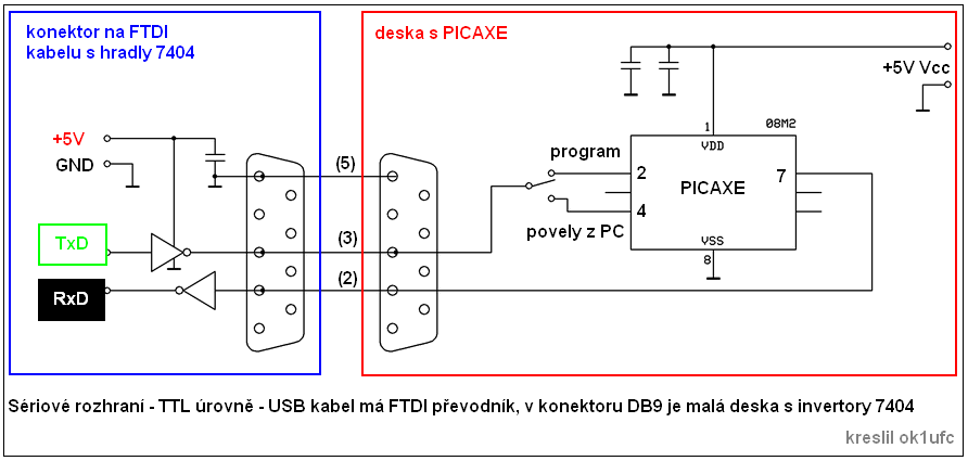 Obvod 7404 je napájen napětím +5V z USB rozhraní (červený drát). Zem GND byla vyvedena u mého kabelu černým drátem. TxData byla vyvedena na zelený drát. V klidu (mezera), jsem na něm naměřil asi 3.5 V. RxData byla vyvedena na bílý drát. Z adaptéru byly vyvedeny ještě signály CTS (modrá) a RTS (žlutá). Tyto nebyly použity. Toto zapojení používám, jak jsem psal, pro zařízení, která leží na stole nebo u hubu. Většinou jde o programátory, zkušební desky a o zařízení, která jsou použita ke komunikaci uvnitř víceprocesorového přístroje. Příklad : Mám dálkově řízený tuner. Jsou v něm celkem 2 desky s elektronikou. Na první desce je PICAXE 20M2, který je připojen k portu RS-232, komunikuje s PC, ovládá celkem 8 relé přepínače indukčností. Z pohledu toku dat přijímá povely z PC a odesílá po sériové lince data do druhé desky. Na druhé desce je rovněž PICAXE 20M2, který přijímá data z prvního procesoru, nastavuje 8 relé přepínače kapacit a 2 relé, která připojují kapacity na vstup nebo na výstup indukčností. A také po sériové lince potvrzuje do prvního procesoru (a ten do PC), že kontrolní byty povelů byly správně přijaty. Do druhé desky je třeba zavést na stole program a spustit testy, že program správně spíná jednotlivá relé. Neviděl jsem důvod mít na druhé desce rozhraní RS-232, stačí jen TTL úrovně a adaptér podle druhého schématu. Závěry Předpokládám, že je všechno jasné a že si