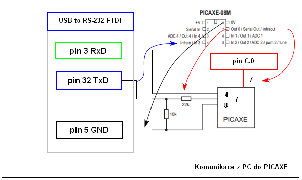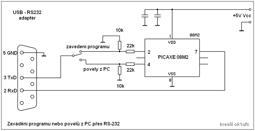 Na řádku bufferu vidíte čtyři bajty qualifiers (254, 254, 118, 224) a jeden bajt s povelem (255). Jde o povel k rozsvícení LEDky. Bohužel, to, co jsem neviděl, byla informace, ke kterému portu editor tento simulátor připojil :-) Inu, i profesionální programátoři, kteří mají tak vynikající produkt, jako je PICAXE, trpí profesionální slepotou o tom, že náhodný kolemjdoucí budoucí uživatel jim do hlavy nevidí a musí bádat v dokumentaci, jak to je. 6. Za výhodu čipů PICAXE považuji také skutečnost, že k naprogramování nepotřebujete žádný programátor. Zkompilovaný kód posílá editor PICAXE rovnou po sériové lince. Elektrická schémata zapojení sériového rozhraní Sériové rozhraní mezi PC a PICAXE lze