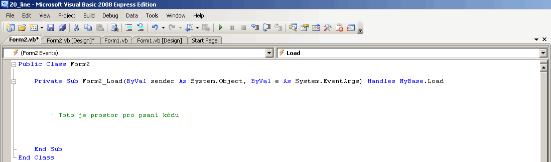 Public Class a End Class. U nového formuláře se nám vygeneruje s tělem
