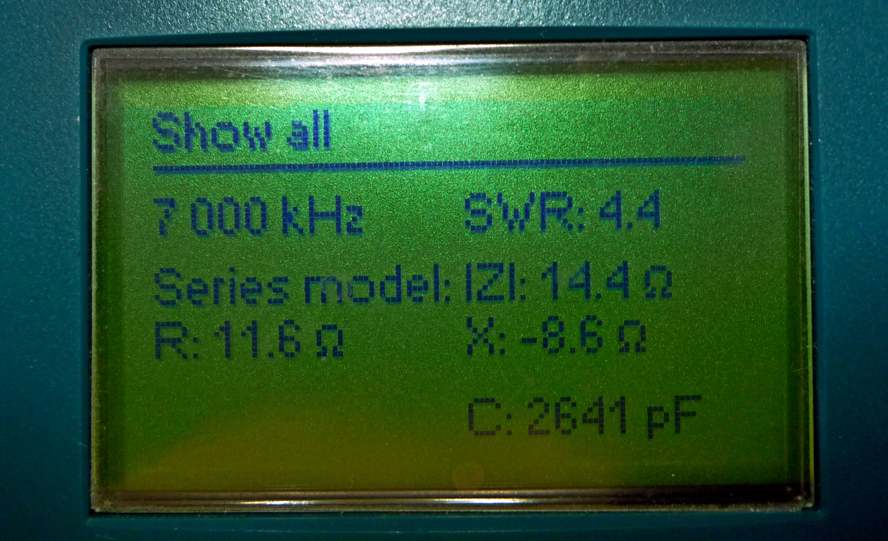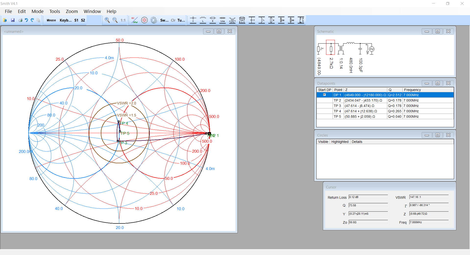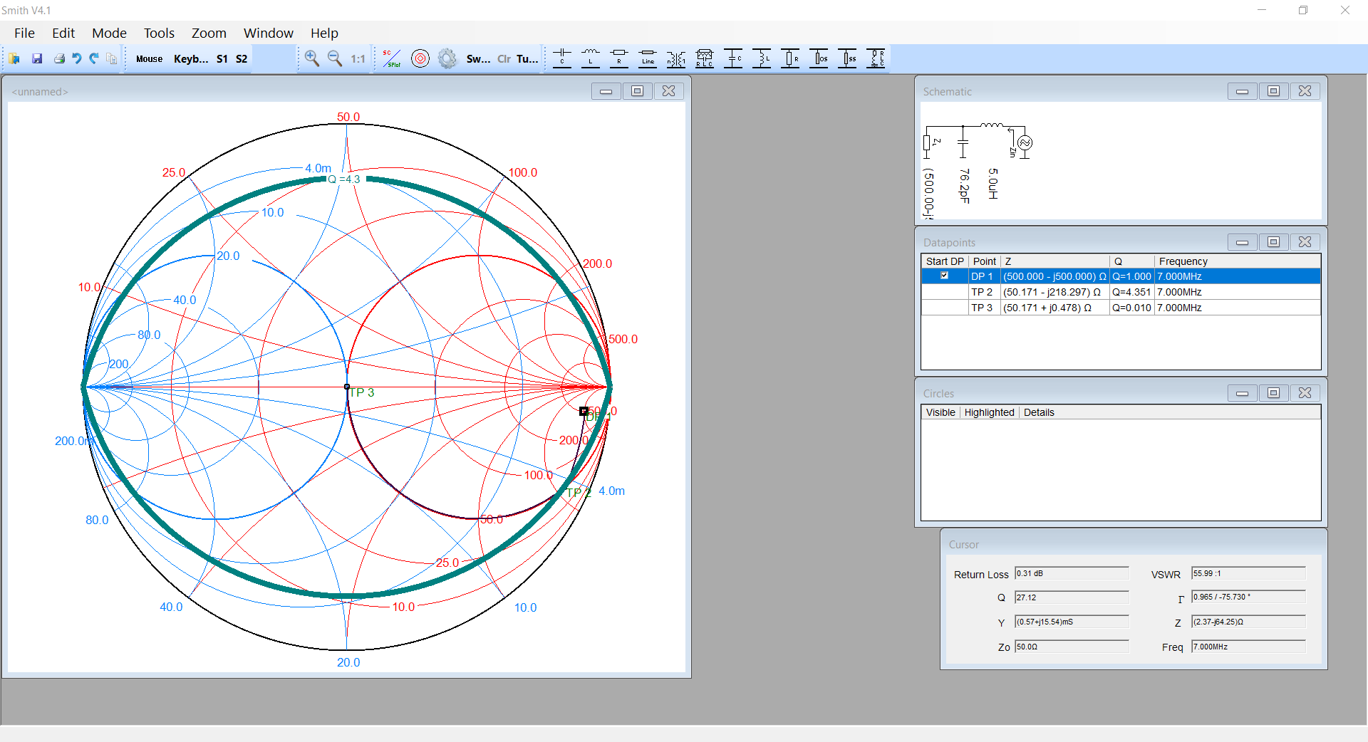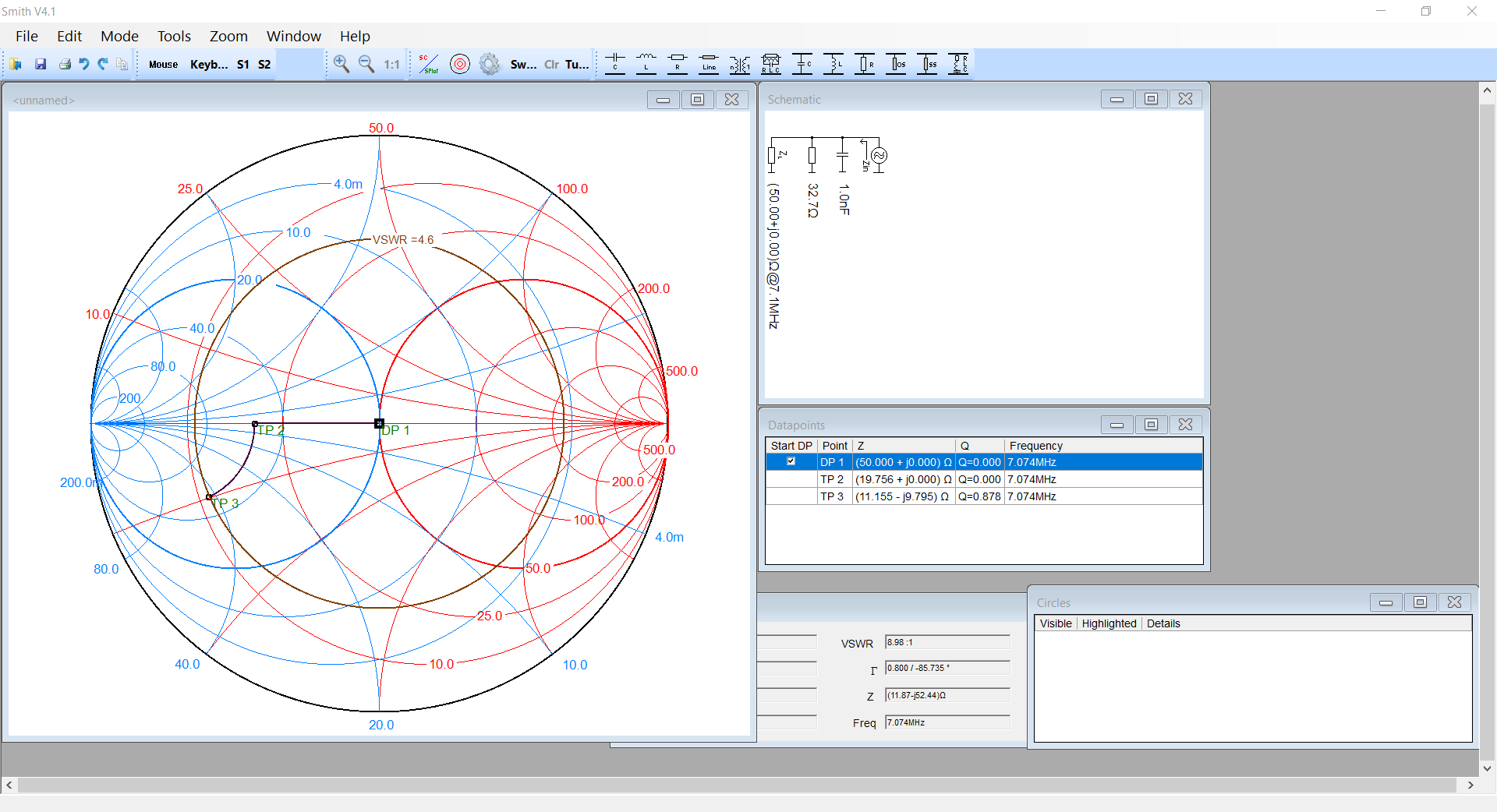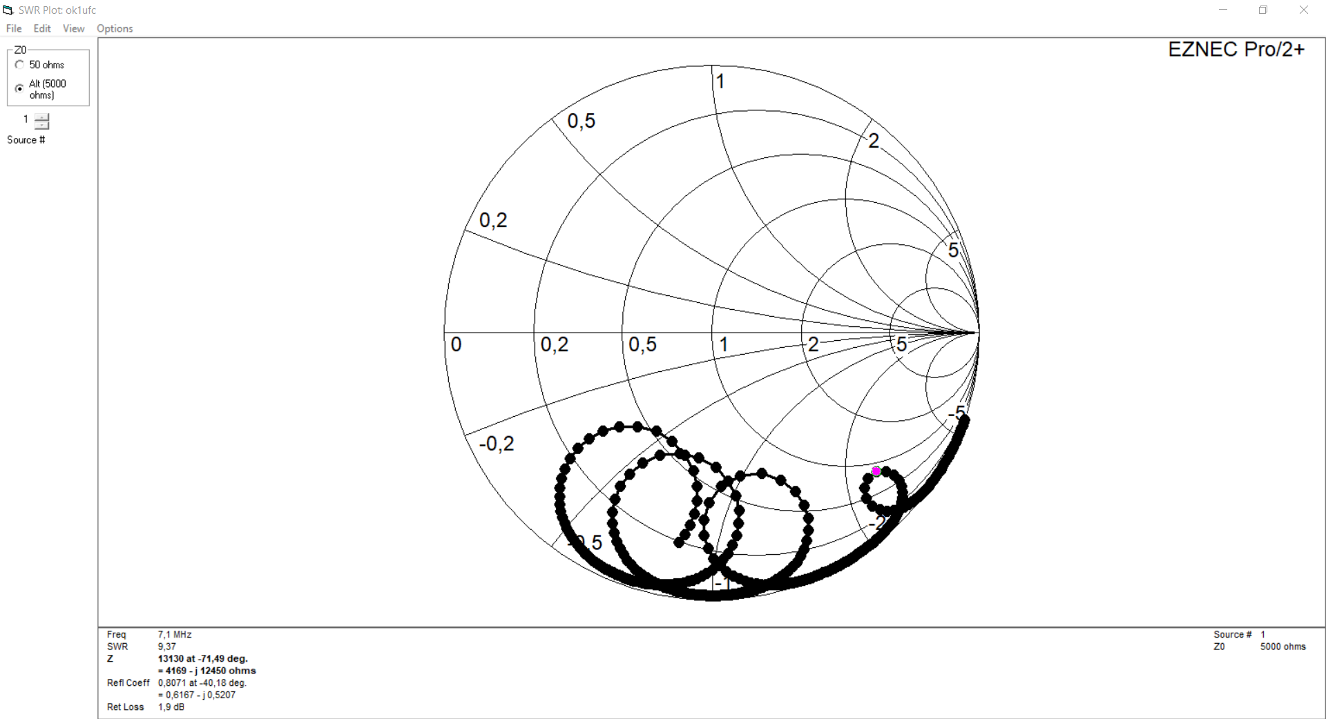 charakteristiky hodnotu pro 7 nebo 7.2 MHz a ukázat ve Smith chart