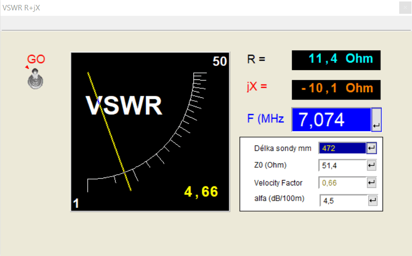 s naměřenou hodnotou Z = 71.93 - j54.5; měřeno na