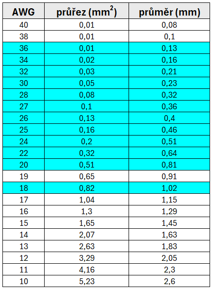 1. Tabulka pro převod AWG označední drátů na průměr a průřez: