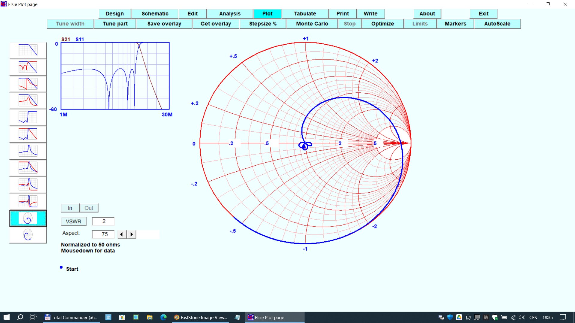 2. vykreslení VSWR ve Smith Chart, abychom si mohli porovnat příslušné výstupy obou programů;