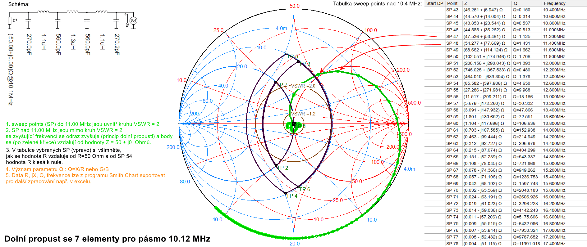 Všimněte si, co je pro tuto dolní propust typické. Parametr Q = X/R (například pro bod SP 43, tj. první bod v tabulce na obrázku platí X=6.947, R=46.261, Q=0.15) se pro propusné pásmo pohybuje uvnitř kruhu VSWR=1.2, tedy nedochází k odrazu. Mimo propustné pásmo se hodnota Q citelně zvyšuje, sweeppointy opouštějí kruhy malých hodnot VSWR (po zelené křivce mizí od středu diagramu). Energie vyšších frekvencí není filtrem přenášena a je odražena. A to je princip dolní propusti.