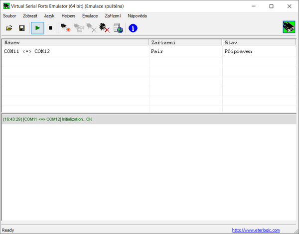 nejdříve virtuální sériové porty COM11 a COM12 vytvořit a