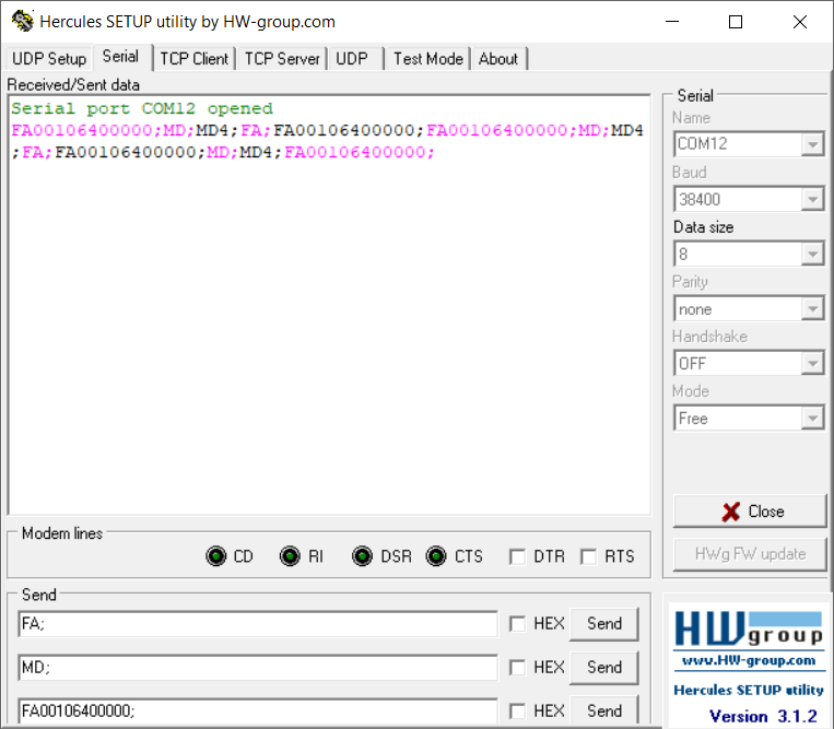 Herkules nastavíme na záložku Serial, připojíme na COM12,