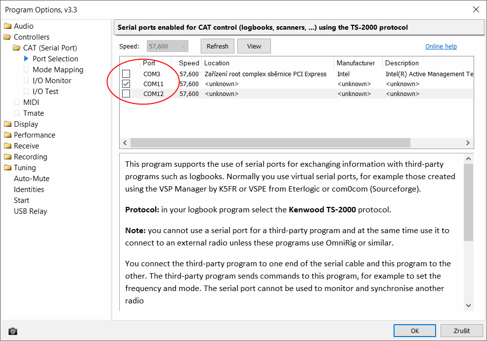 portu COM11 - viz zaškrtnutý čtvereček.