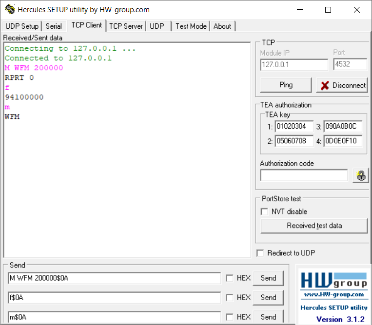 Zvolím záložku TCP Client, nastavím IP: 127.0.0.1 a Port: