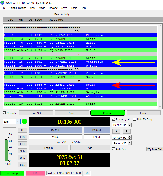 kdy signál FT8 je stále ještě čistý a dokonale detekovatelný;